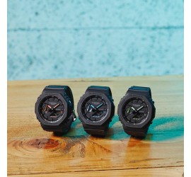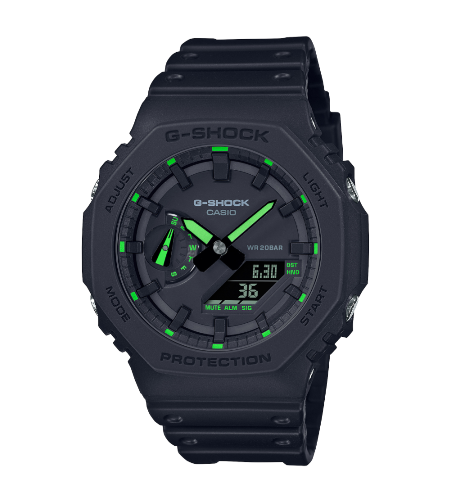 Puedes lucir una pequeña explosión de color sobre negro mate con un diseño especial que destaca gracias a las notas de neón. La forma octogonal y el diseño estilizado del GA-2100 aúnan el negro mate texturizado y vibrantes colores de neón para crear una estética innovadora, elegante y moderna. Las manecillas de las horas y los minutos con pintura fosforescente son visibles en la oscuridad, para que sepas la hora en cualquier momento del día o la noche.