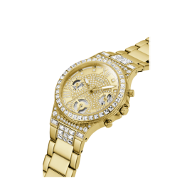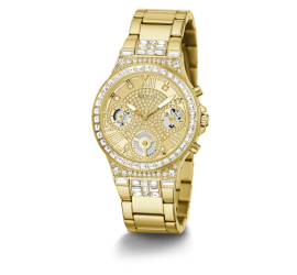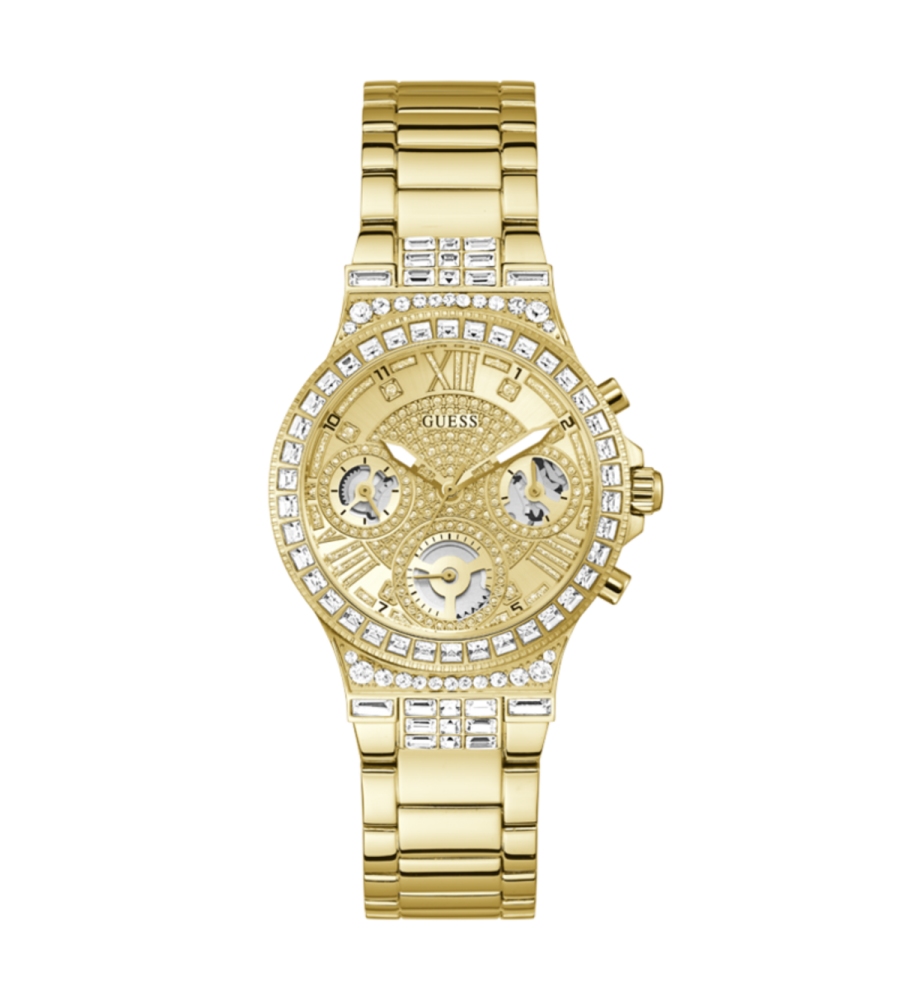 Reloj de acero de mujer de la marca Guess. Caja y brazalete dorados donde la pedrería de convierte en la estrella, tanto en el bisel como en los primeros links. La esfera también se camufla entre pedrería y muestra el movimiento a través de los ojos. Moonlight es una colección irresistible que hace girar miradas y se convierte en el objeto de deseo de cualquiera.