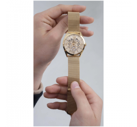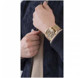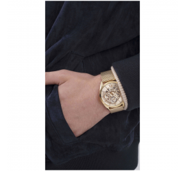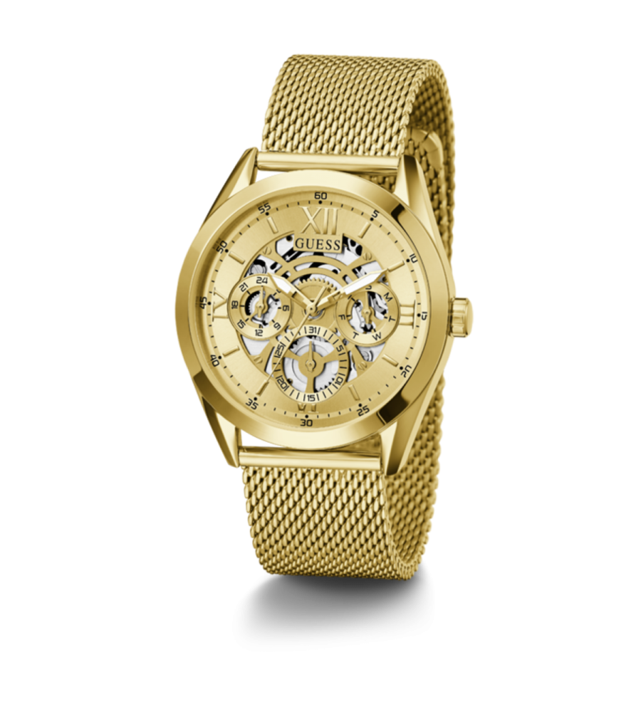 Reloj de acero de hombre de la marca Guess. Caja de 42mm en acabado brillante. Esfera multifunción con movimiento visto. Brazalete de malla. Todo en dorado. Elegancia en esta colección, perfecta para los hombres elegantes y sobrios.
